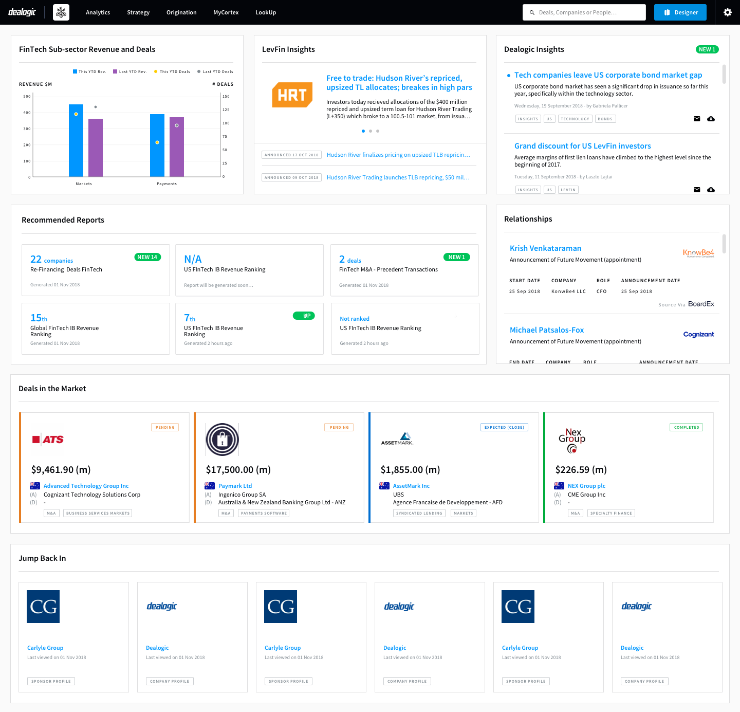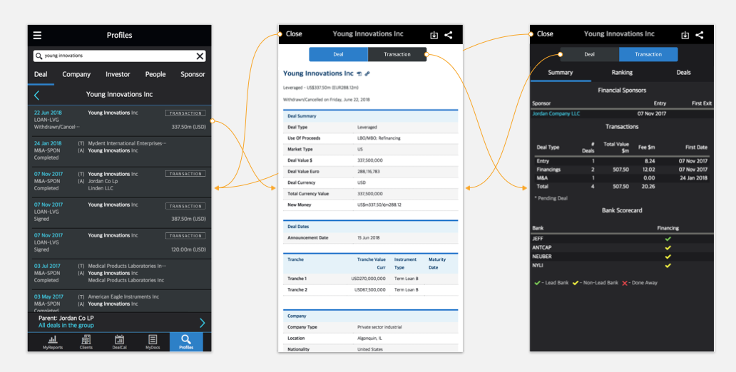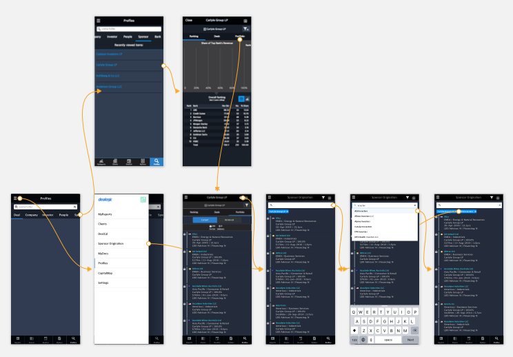 On the Origination pillar I started working on the Dealogic iOS/Android app. In my focus there were profile pages of deals, companies and banks. I provided solutions for data visualisation and interaction design. During this period I learned the most about the investement banking domain.